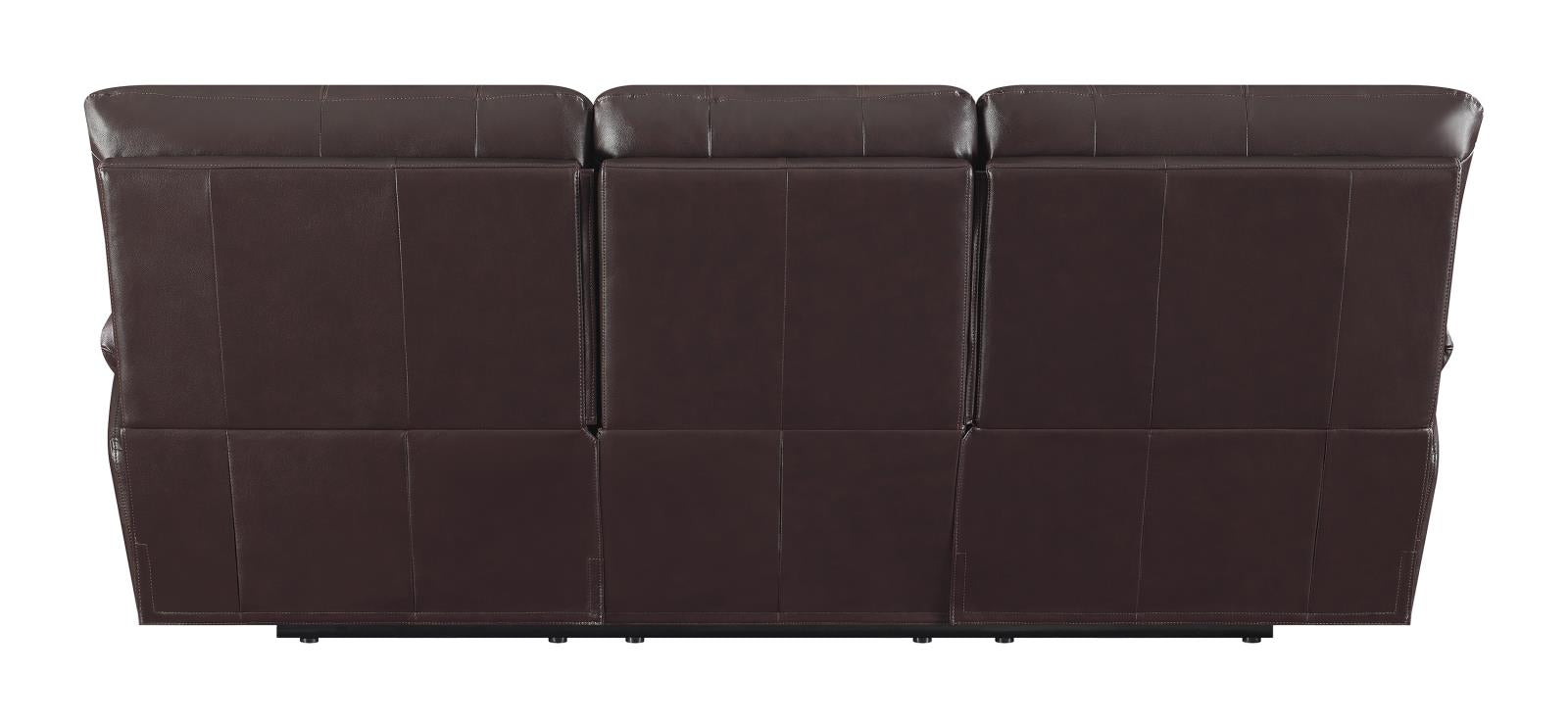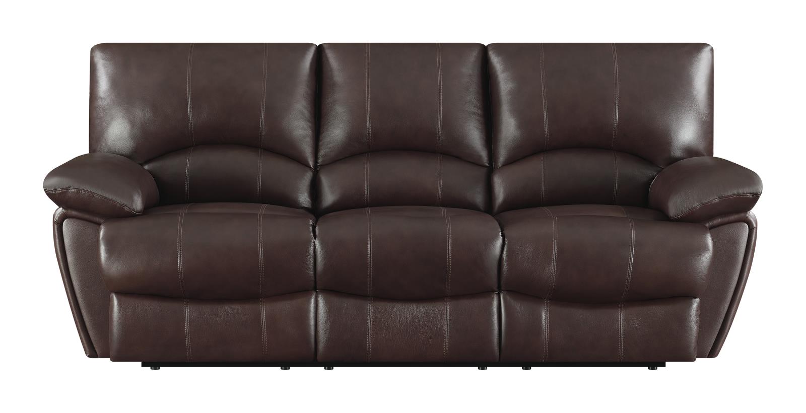 Structure is given a refined look in this three-piece motion set. Includes a reclining sofa, loveseat, and recliner with ultra plush cushioning. Sink back into to padded head and arm rests, streamlined with sophisticated horizontal lines. Warm chocolate upholstery creates a sophisticated look. Fill of comfort, the kidney support backs are perfect for long periods of sitting.