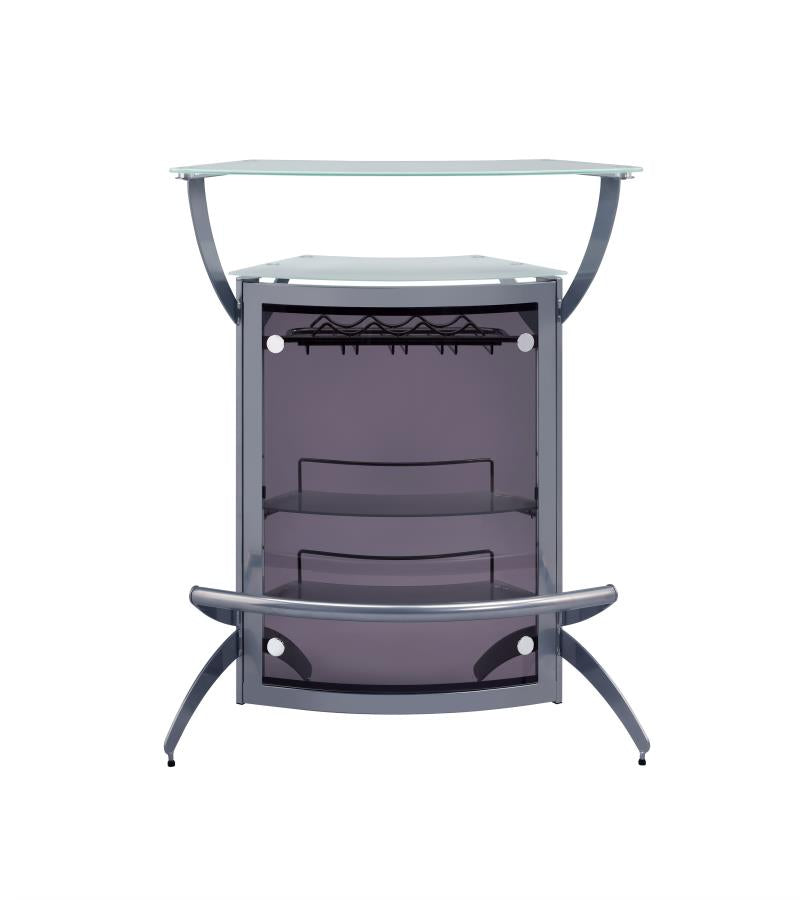 From fancy dinner parties to laid-back barbecues, this magnificent metal bar unit is the perfect upgrade to any room where guests may gather. Its versatile design provides a variety of convenient options for your entertaining needs. The contemporary curves of its metal frame add a sleek, sophisticated aesthetic, while transparent smoked acrylic panels put your glassware collection on proud display. A frosted, tempered glass top finishes off its bold, modern look. Featuring a handy metal rack for stemware and multiple shelves, this unit easily accommodates a wide variety of bar accessories.