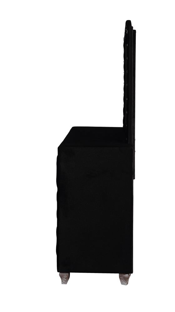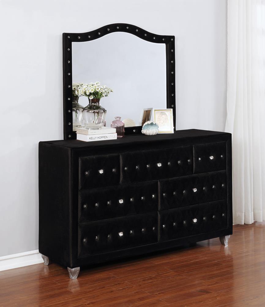 Transform a sophisticated space with this stunning large black mirror. The traditional silhouette gets a modern upgrade with soft velvet fabric. Luxurious and shiny, the crystal button tufted trim radiates chic light throughout a bedroom. With angled corners and a slight bell curve, this sleek mirror looks great above a dresser. Apply makeup or do your hair in the richly elevated reflection.