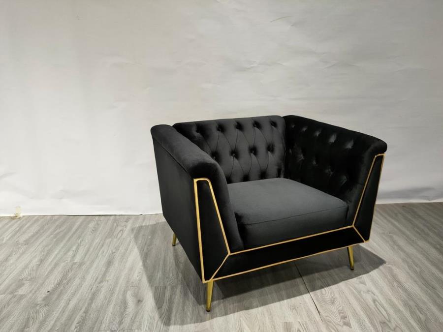 Complete an upscale living space with the luxe look and feel of a modern glam armchair. Plush black velvet upholstery and button tufting create a rich, elegant presentation and perfectly augments the mid-century character of its silhouette. Tuxedo arms create a sheltered effect and flair slightly, emphasized with geometric trim work in gleaming gold that highlights the front of the chair. Splayed metal leg match, adding a sophisticated, vintage inspired vibe. Plush foam cushions complement webbing support, and the seat is further equipped with sinuous spring for optimal comfort and support.