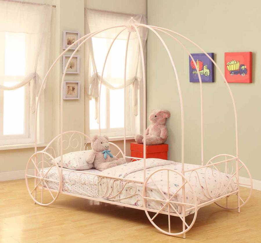 This twin canopy bed has a whimsical design that's fit for a fairy tale. Reminiscent of Cinderella's carriage, it's a charming addition to a little girl's room. Its elegant frame features a sleek, swirling silhouette, giving it a glamorous look. Its pink finish rounds it out with a pleasingly feminine flair. Perfect for the little princess in your life, this beautiful bed is sure to delight.