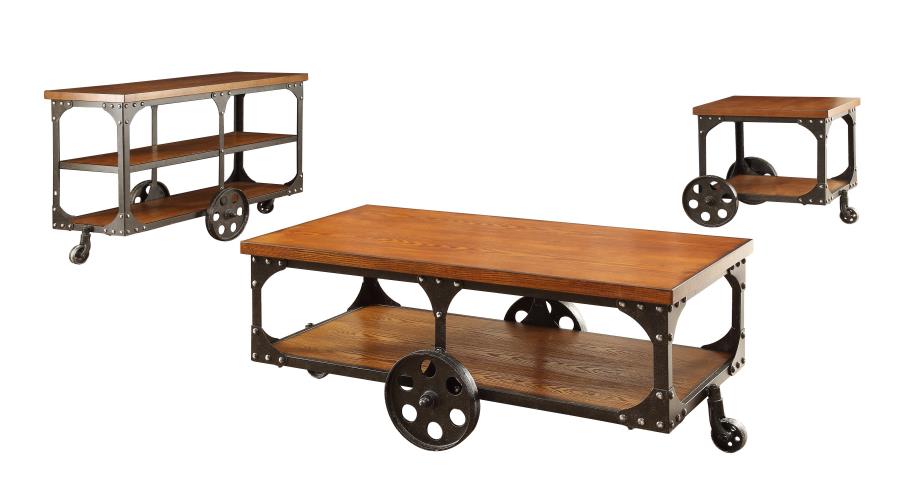 Enhance a traditional living room with down-home, country appeal. This coffee table is crafted with two large panels of rustic brown wood, infusing it with old-fashioned charm. Its classic silhouette is appealingly offset by the dark metal finish of its frame. A sturdy table top and large lower shelf offer ample storage space for your convenience. Complete with four fully functioning metal wheels, this table is attractive and versatile.